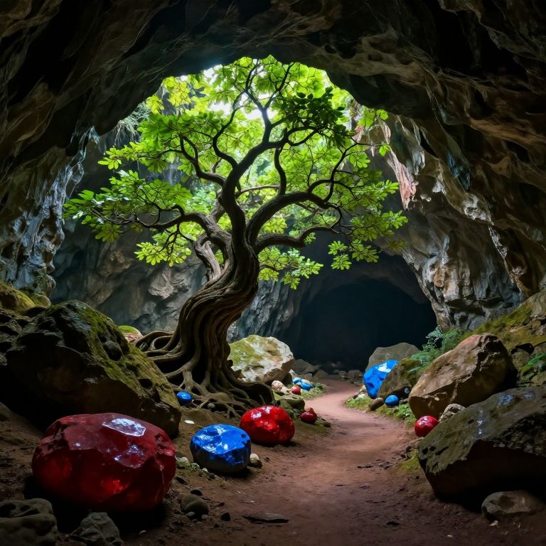 Emerging from a cavernous entrance, a vibrant subterranean landscape unfolds, featuring a gnarled tree with sprawling branches adorned by luminous green leaves that capture sunlight streaming through a distant opening, surrounded by scattered rocks, including striking red and blue gemstones, while a narrow dirt path winds through the scene, leading deeper into the mystical valley beyond.