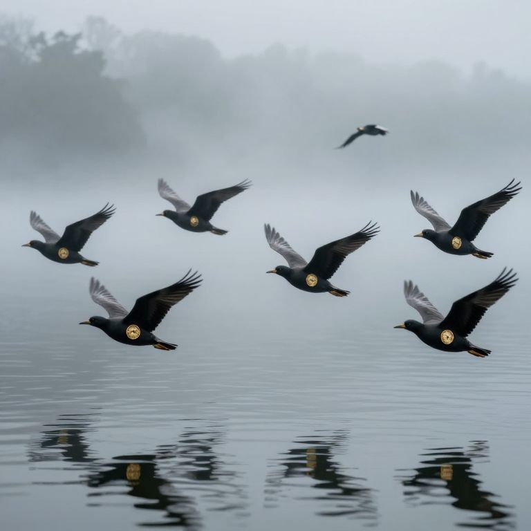A flock of enigmatic birds adorned with golden clockwork medallions soars gracefully above a misty lake, their wings casting ripples of time into the water below.