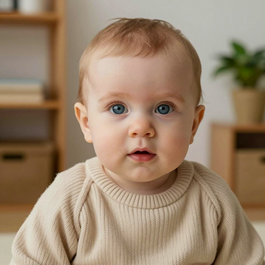 Photograph of a baby with bright blue eyes, fair skin, and light brown hair. She wears a light blue knitted hat with a bow on top and a white dress with blue patterns. Her lips are slightly parted. Background is blurred beige.