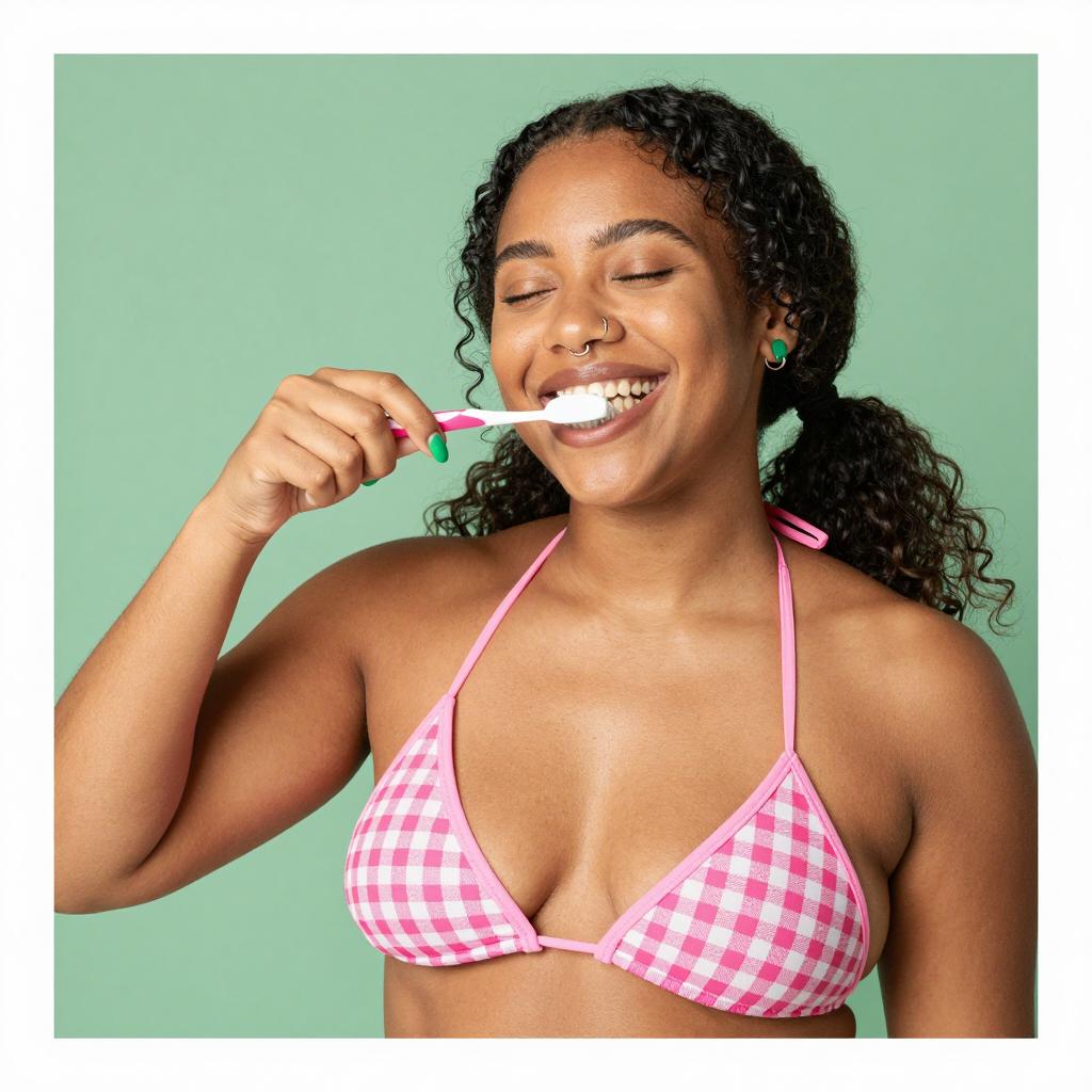 Young woman with fair skin and light brown hair brushing her teeth with a purple toothbrush. She has slightly pouty lips and a neutral expression. Background features a patterned wallpaper with yellow flowers on a white and blue background. She wears a pink shirt. A hand holds the toothbrush. Close-up shot.