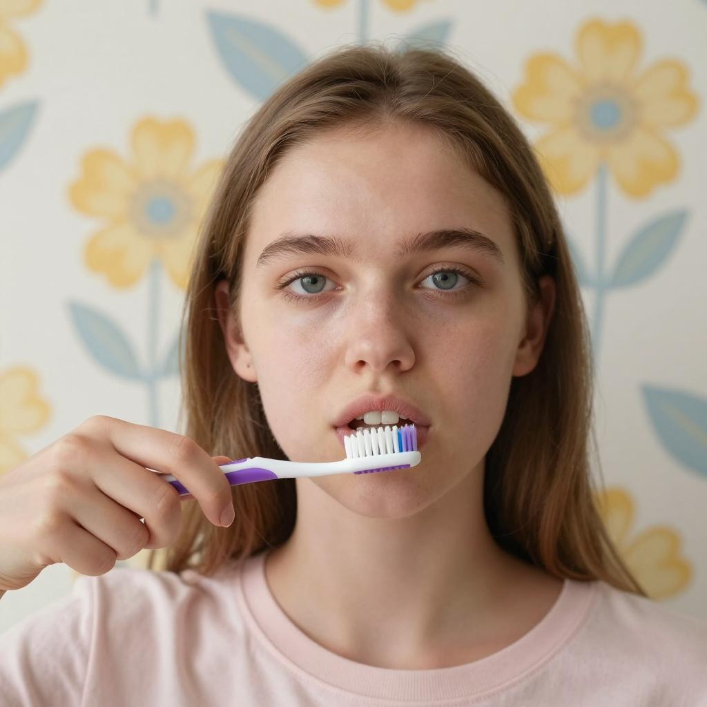 Close-up portrait of a young woman with fair skin and light brown hair brushing her teeth using a purple and white toothbrush. She wears a light pink shirt and has a neutral expression with slightly pouty lips. The background features wallpaper with yellow flowers and blue leaves on a white base, creating a soft and calm atmosphere.