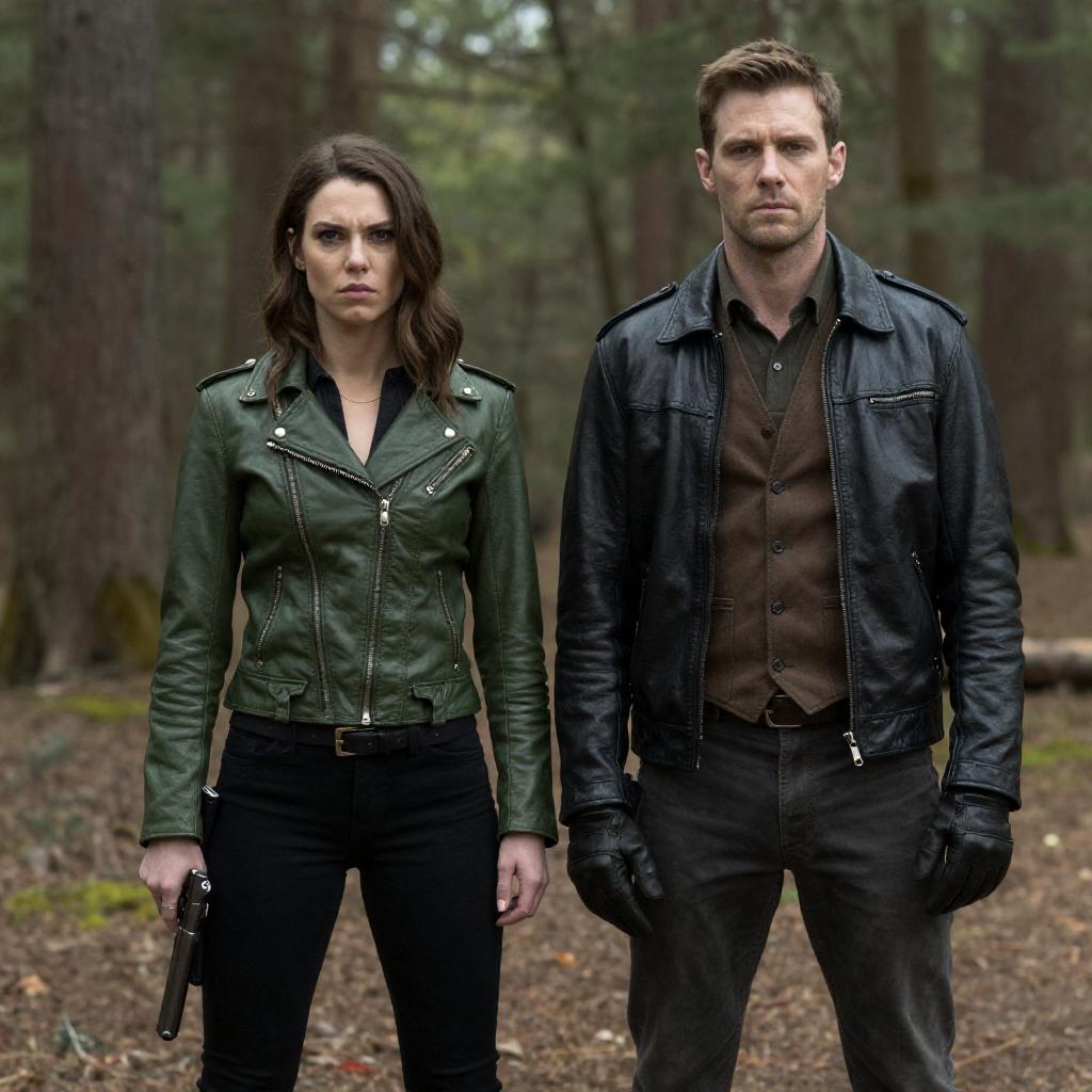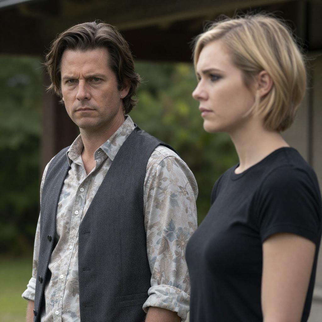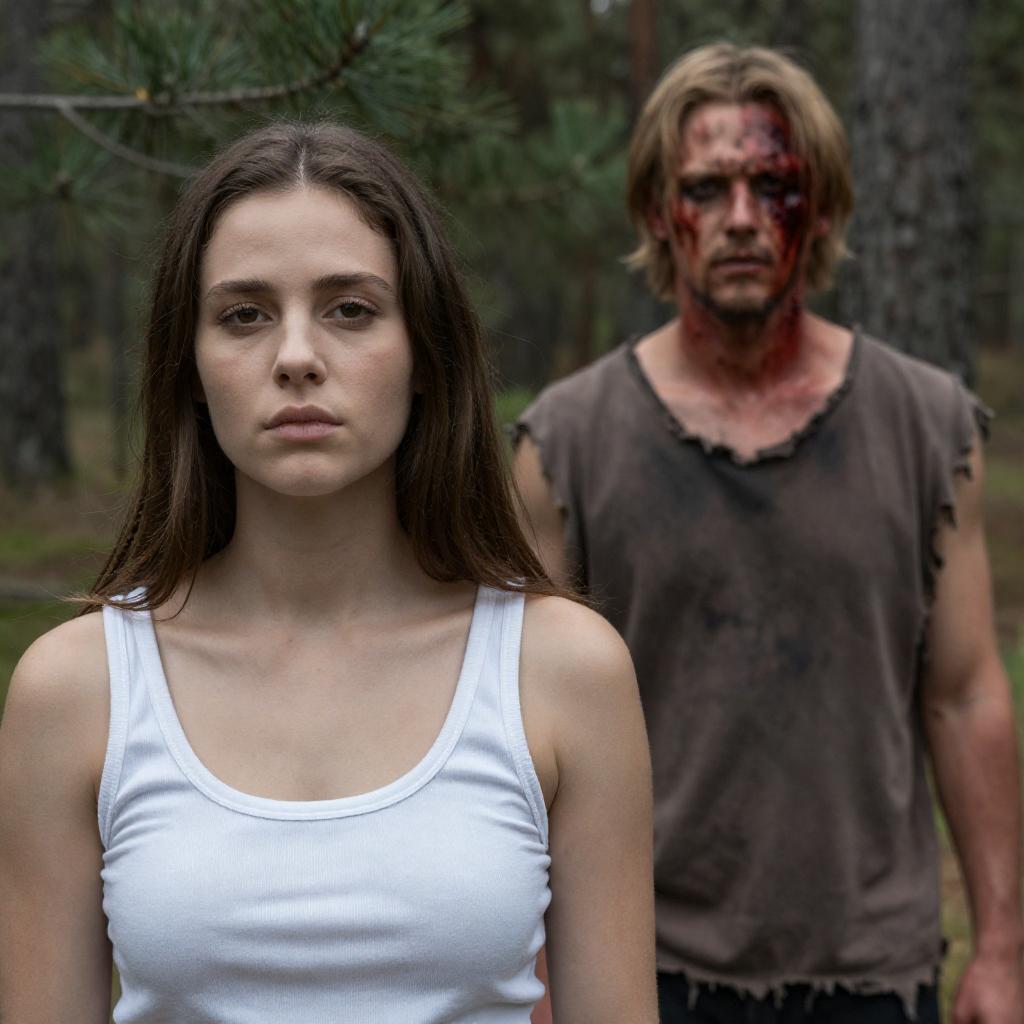 Photograph of a man and woman standing beside a yellow, rusted truck. Man with wet hair, blue shirt, holding gun, intense expression. Woman with brown hair, white tank top, minor injuries, serious expression. Background: truck, greenery. Both look worn.