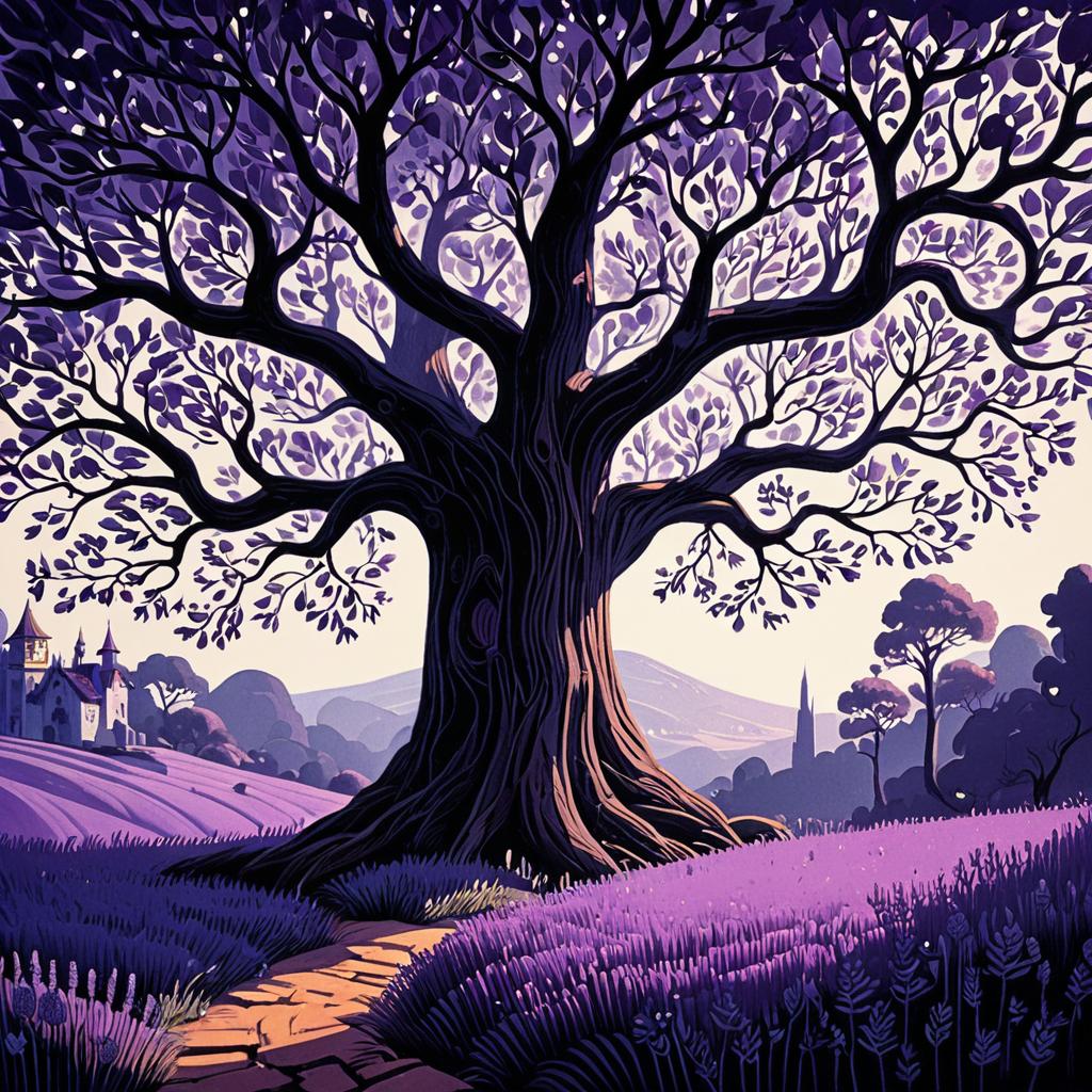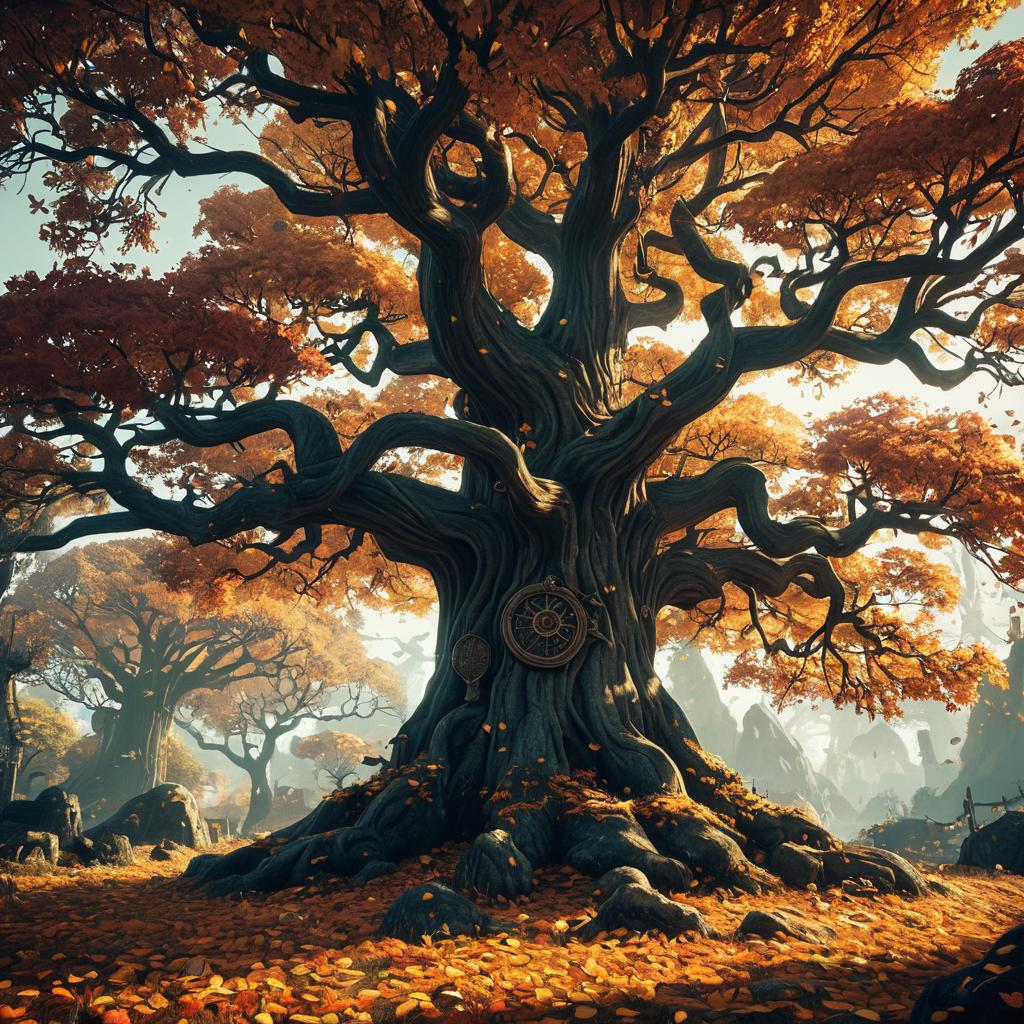 A tree of the magical world, stylized with silver tones, animated film look, fantasy art, 2D game art, by James Gurney, Brian Froud, Genndy Tartakovski, Claude Monet, cgsociety, cynical realism