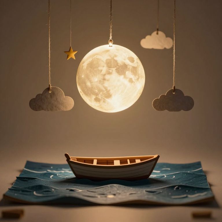 Photograph of a hand-made diorama scene featuring a small boat floating beneath a full moon, with stars and clouds as cutouts hanging from strings, the full moon itself is also suspended by a string, creating a surreal, dreamlike atmosphere, the sea is a painted cutout with gentle waves, the entire scene is illuminated with soft, warm light, enhancing the whimsical and tranquil mood, the handcrafted elements, including the visible textures of the materials, add to the scene's nostalgic and peaceful charm