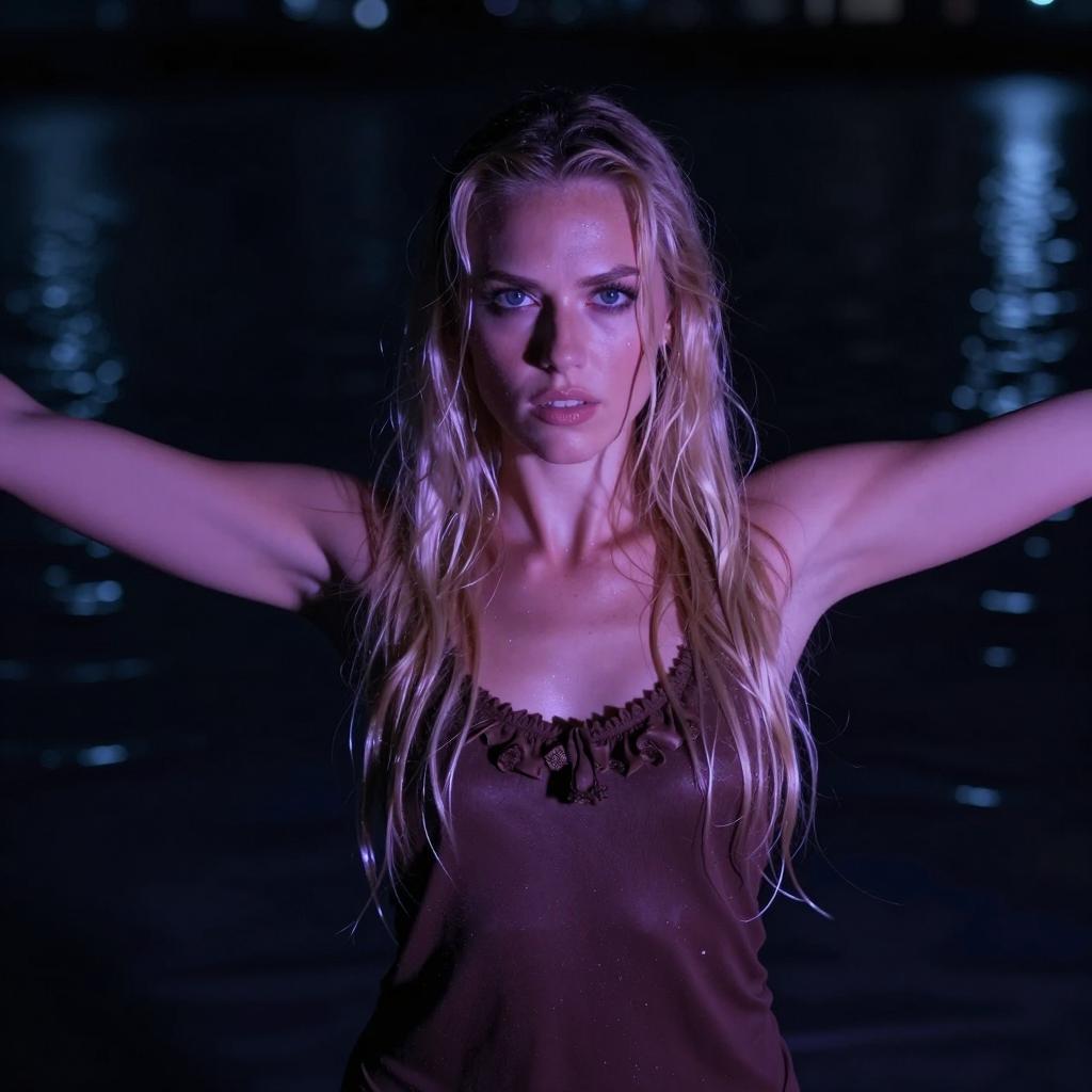 Woman with long, wavy, light brown hair holds a brass candelabrum with six lit white candles in her right hand. She wears a yellow, sheer, short-sleeved top and a gold necklace. She has a serious expression. Dimly lit, shadowy background.