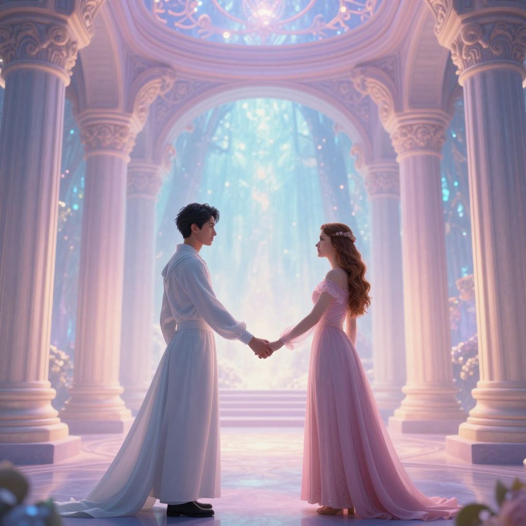 Digital artwork of a romantic scene set in an ethereal, ornate hall with tall, white columns and a radiant, glowing archway in the background. A young man with short, dark hair, wearing a long, white robe, holds hands with a young woman with long, wavy brown hair, dressed in a flowing, pink gown. Both gaze into each other's eyes, standing on a polished, reflective floor that amplifies the soft, blue and pink light. The scene is bathed in a magical, dreamlike glow, with subtle sparkles and a sense of timeless romance.