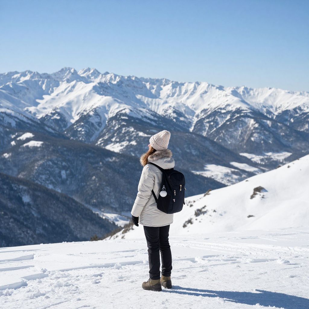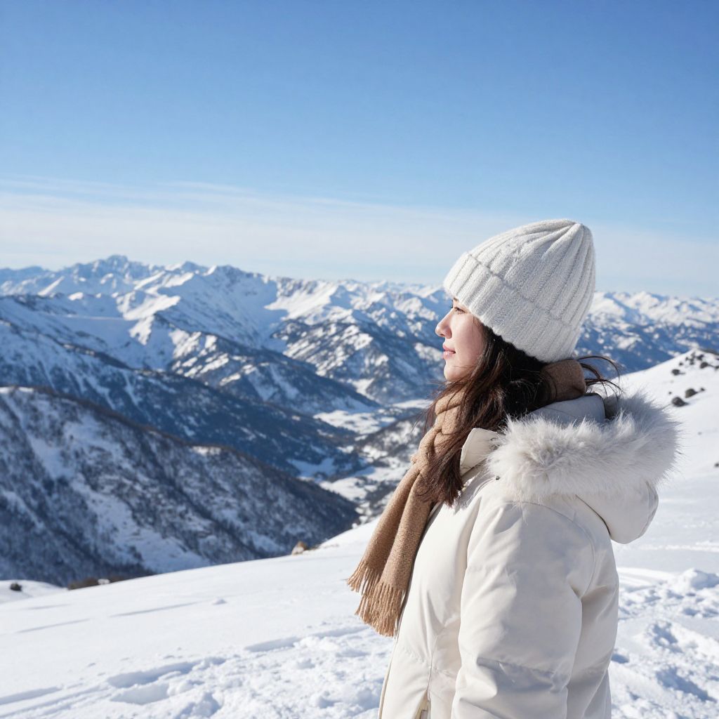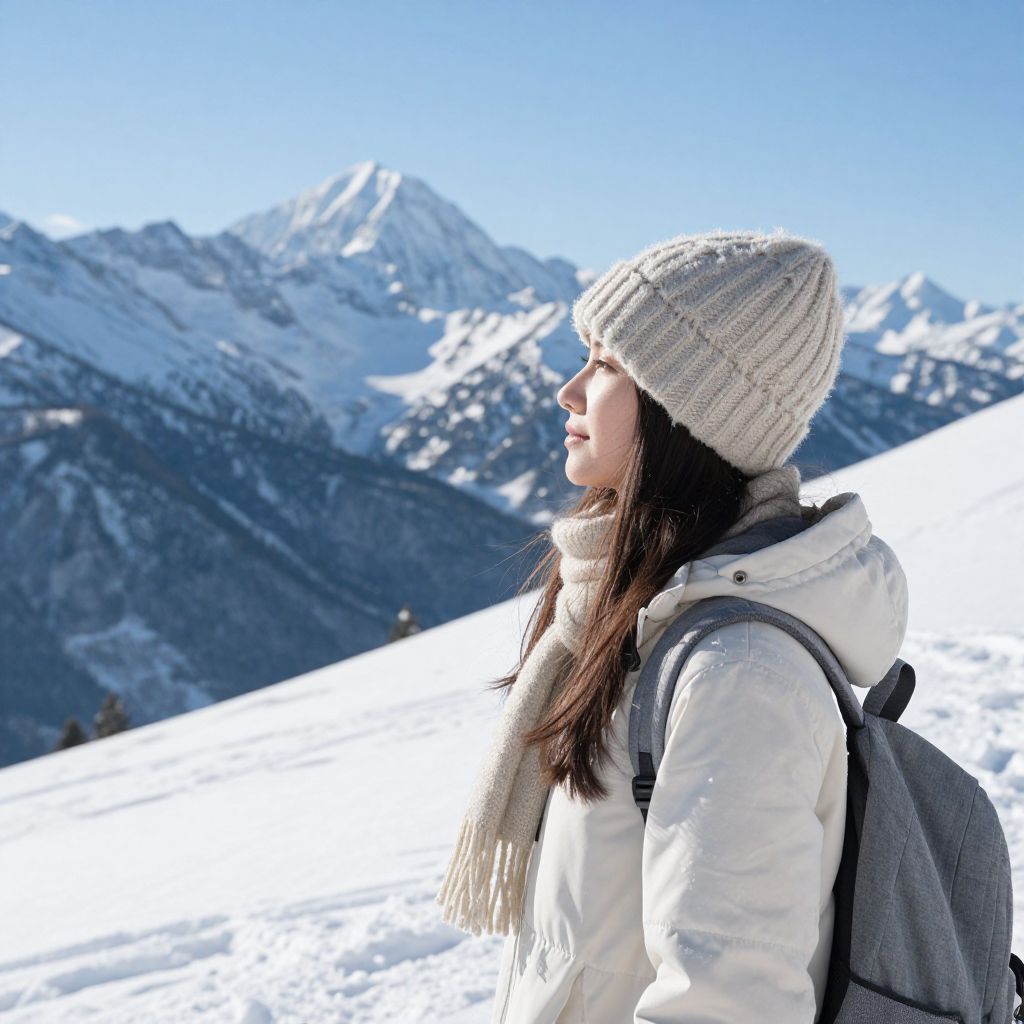 Photograph of a young woman with long dark hair, wearing a white puffy coat with a fur hood, a cream knit beanie, and a gray scarf. She is standing in a snowy mountain landscape, gazing to the left. The background features rugged, snow-covered mountains under a clear, bright blue sky. Her coat and scarf contrast with the white snow, while her beanie and the mountain's grayish-brown rocky sections provide additional texture. The sunlight casts sharp shadows, highlighting the snow's texture and the woman's profile.