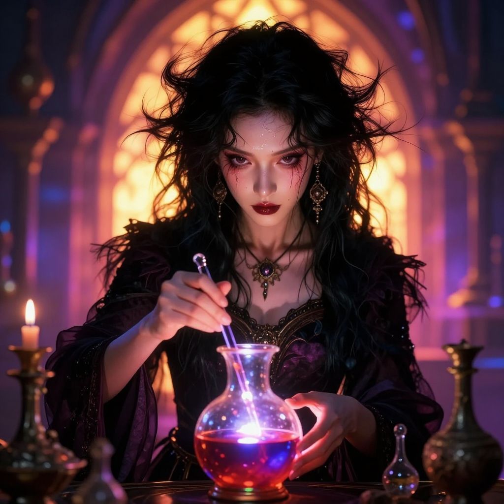 Digital art of a mysterious, dark-haired woman with glowing eyes, wearing black lace, mixing colorful liquids in a glass flask in a dimly lit,