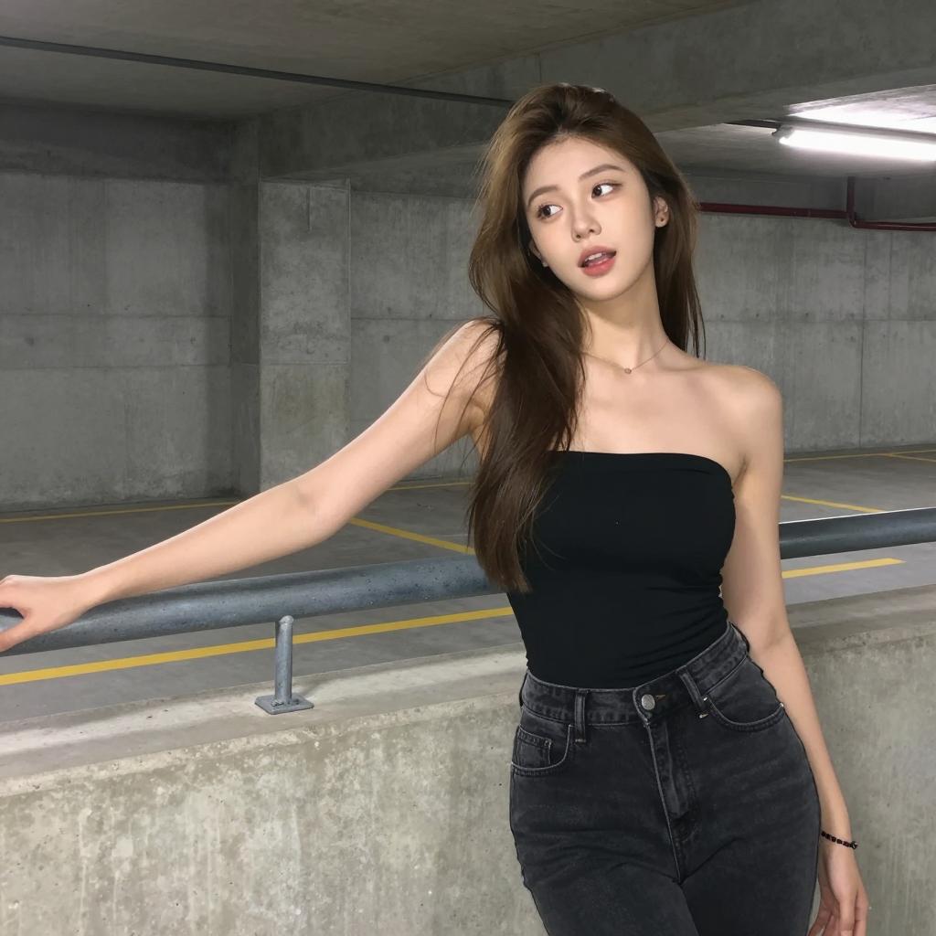 Young woman with long brown hair, wearing a black strapless bandeau top and high-waisted dark jeans, standing in a parking garage. She leans against a concrete wall with metal railing. Gray concrete walls and yellow painted lines in the background. Bright lighting. Casual pose, eyes looking slightly upward, mouth slightly open. One arm resting on the wall, other arm relaxed by her side. Urban setting.