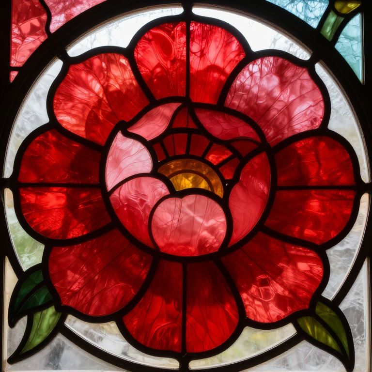 A large stained glass peony window, glowing with deep reds and soft pinks, delicate petals outlined in black metal, sunlight filtering through the translucent glass, highlighting the texture and depth of each petal, surrounded by green leaves