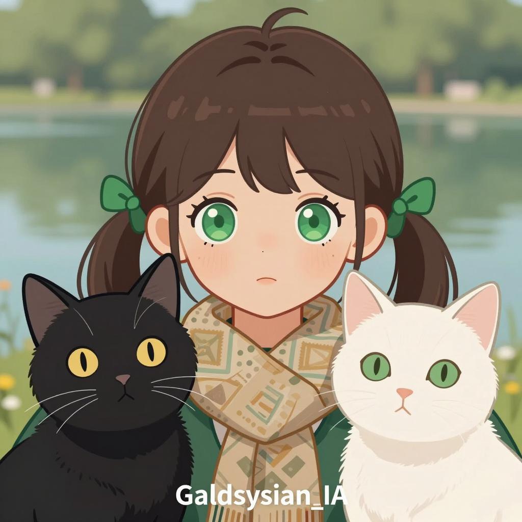Digital illustration of a young girl with large green eyes, brown hair in pigtails with green ribbons, wearing a patterned scarf. She has a black cat with yellow eyes on her left and a white cat with green eyes on her right. Background shows a blurred blue-green lake and trees. Girl's expression is neutral, cats look alert. "Gladsysian_IA" is visible at the bottom.