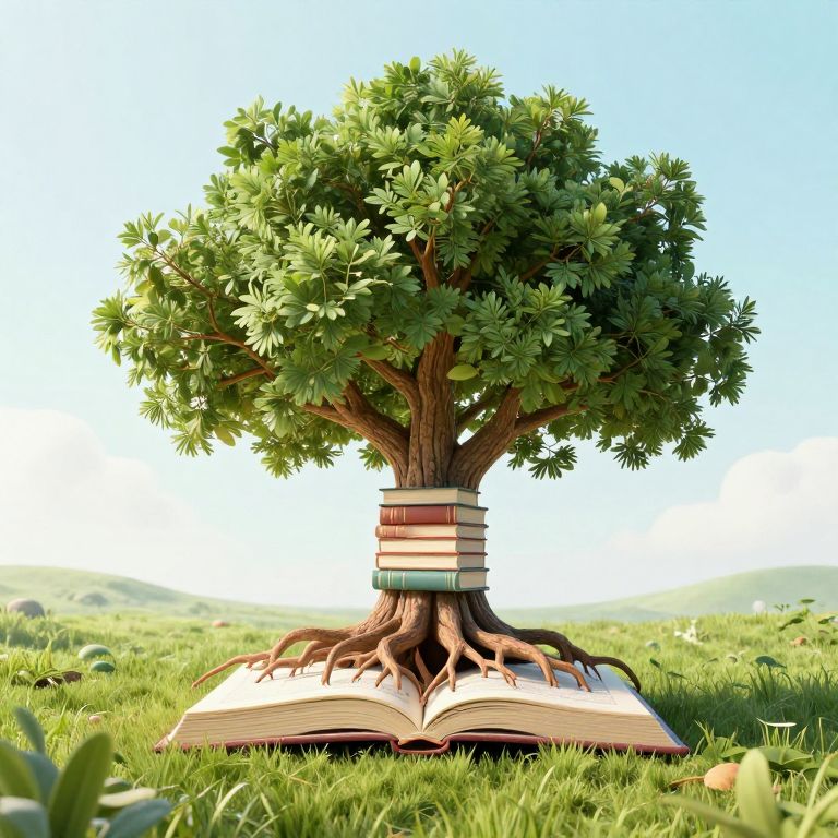 A digitally rendered, surreal image of a lush green tree with a thick, brown trunk and dense foliage, standing in a grassy field under a bright blue sky. The tree's trunk is wrapped with a stack of colorful, horizontally aligned books, which are also connected to an open book lying on the grass at the base. The open book has visible text and pages, blending with the natural surroundings. The grass is vibrant green, with small rocks scattered around. The image combines elements of nature and literature in a whimsical, imaginative style.