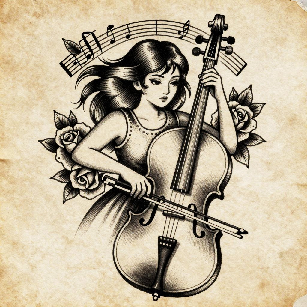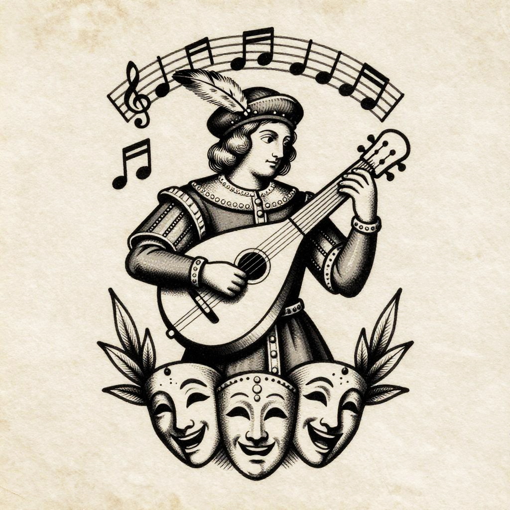 Monochrome ink illustration in a vintage tattoo flash aesthetic featuring renaissance bard playing lute wearing feathered cap and doublet, framed by musical notes above, scrollwork flanking, and theatrical masks below. Printed on faded canvas texture, with crisp linework, stippling and crosshatching, bold negative space, subtle vignette, museum-print finish, high contrast, fine detail, gritty yet elegant mood.