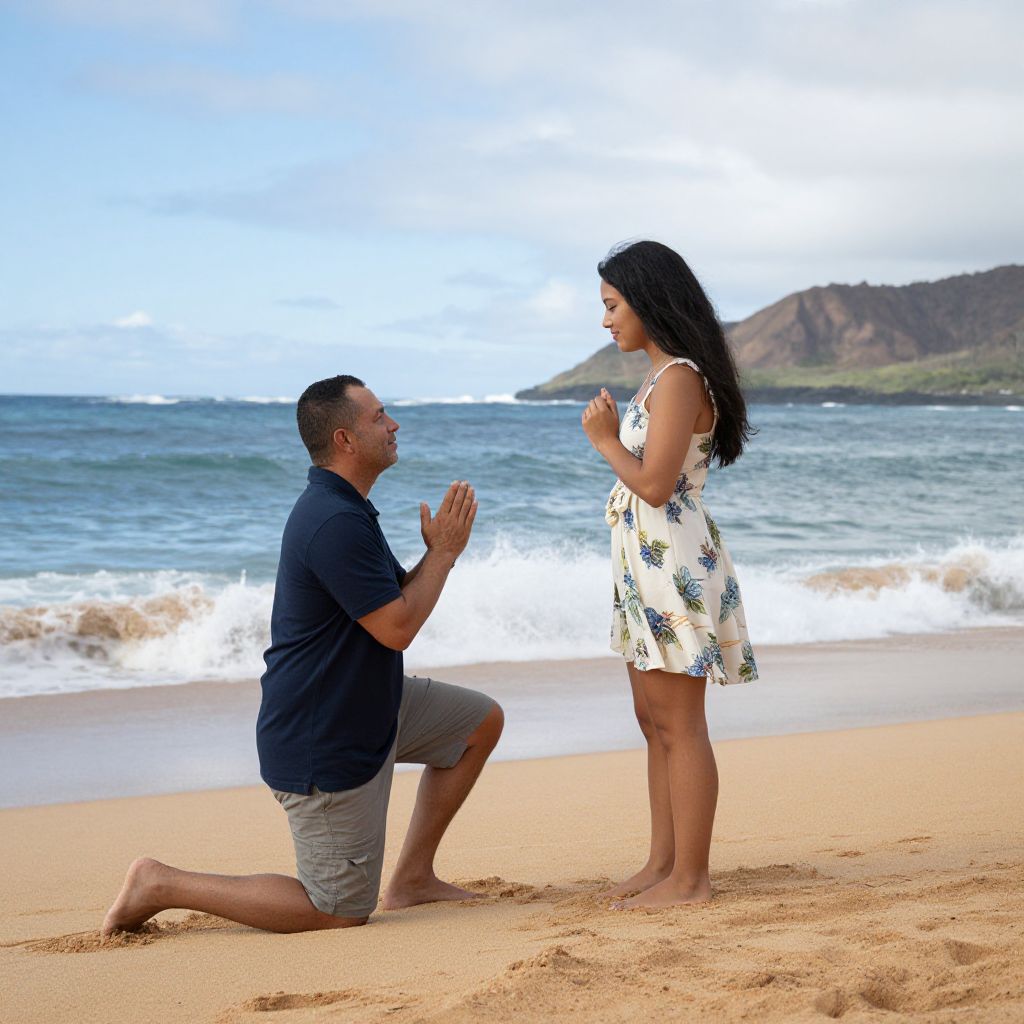Man kneels on sandy beach in Oahu, Hawaii, proposing to woman in floral dress as waves roll in behind them under a partly cloudy sky.