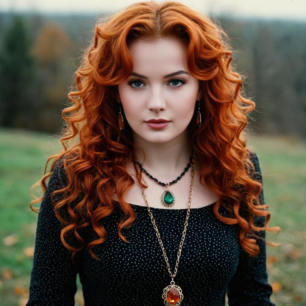 Portrait of a young woman with long curly red hair wearing a black dress with long sleeves and ornate necklaces featuring green and amber gemstones. She is standing outdoors with a blurred natural background, looking directly at the camera.
