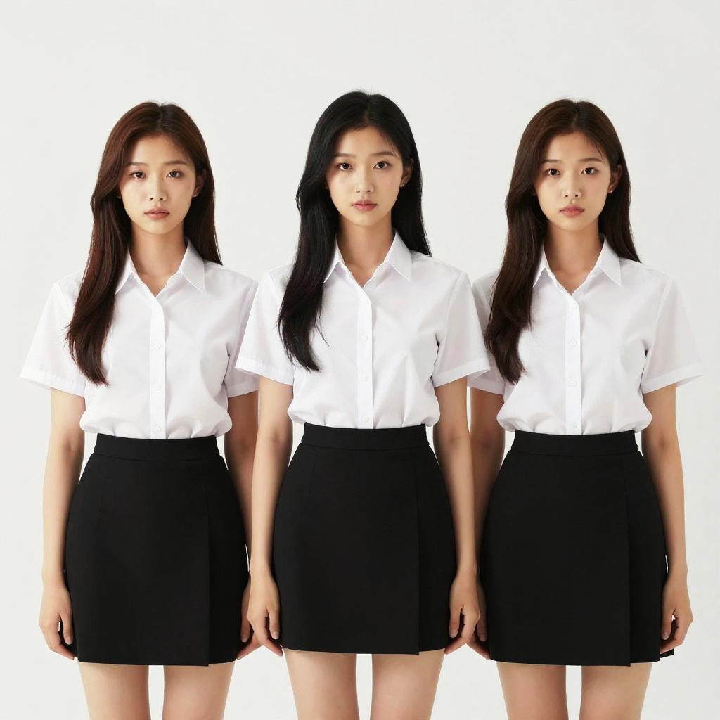 This is a digitally edited photograph featuring three young Asian women standing side by side against a plain white background. They all have straight, long black hair with bangs, and are wearing identical outfits consisting of white, long-sleeved, button-up shirts and high-waisted, black pleated skirts. Their expressions are neutral, and they are standing with their hands by their sides. The women have fair skin and are positioned in a symmetrical arrangement. The image has a clean, high-contrast style with sharp details and bright colors.