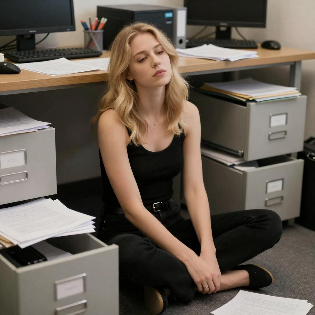 Photograph of a blonde woman with fair skin, wearing a black tank top and black pants, sitting on the floor in a cluttered office. She is surrounded by open file drawers, scattered papers, and office equipment. She looks tired and contemplative. The background includes a wooden desk and a computer monitor.
