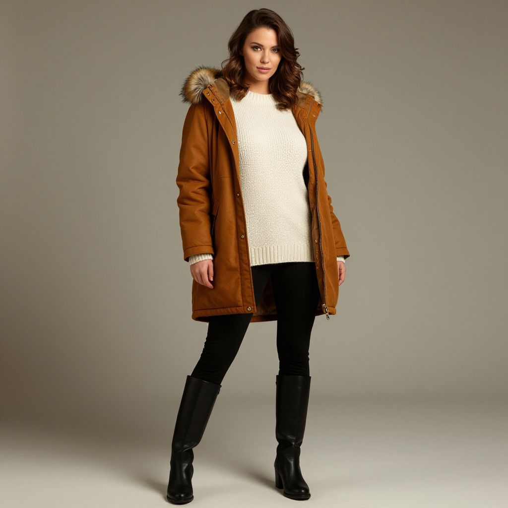 "Woman, casual winterwear, warm caramel-toned parka with fur-lined hood, zip front with button placket, black leggings, chunky knit ivory sweater, mid-calf black leather boots with slight heel, neutral studio background.. Sexy. Pretty face and beаutiful eyes. Big breasts."