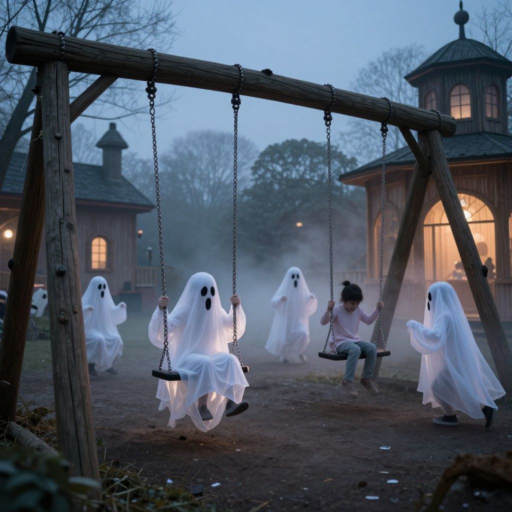 Photograph of a spooky evening scene with white ghost costumes on swings, a child in a pink shirt sitting on another swing, and foggy wooden play