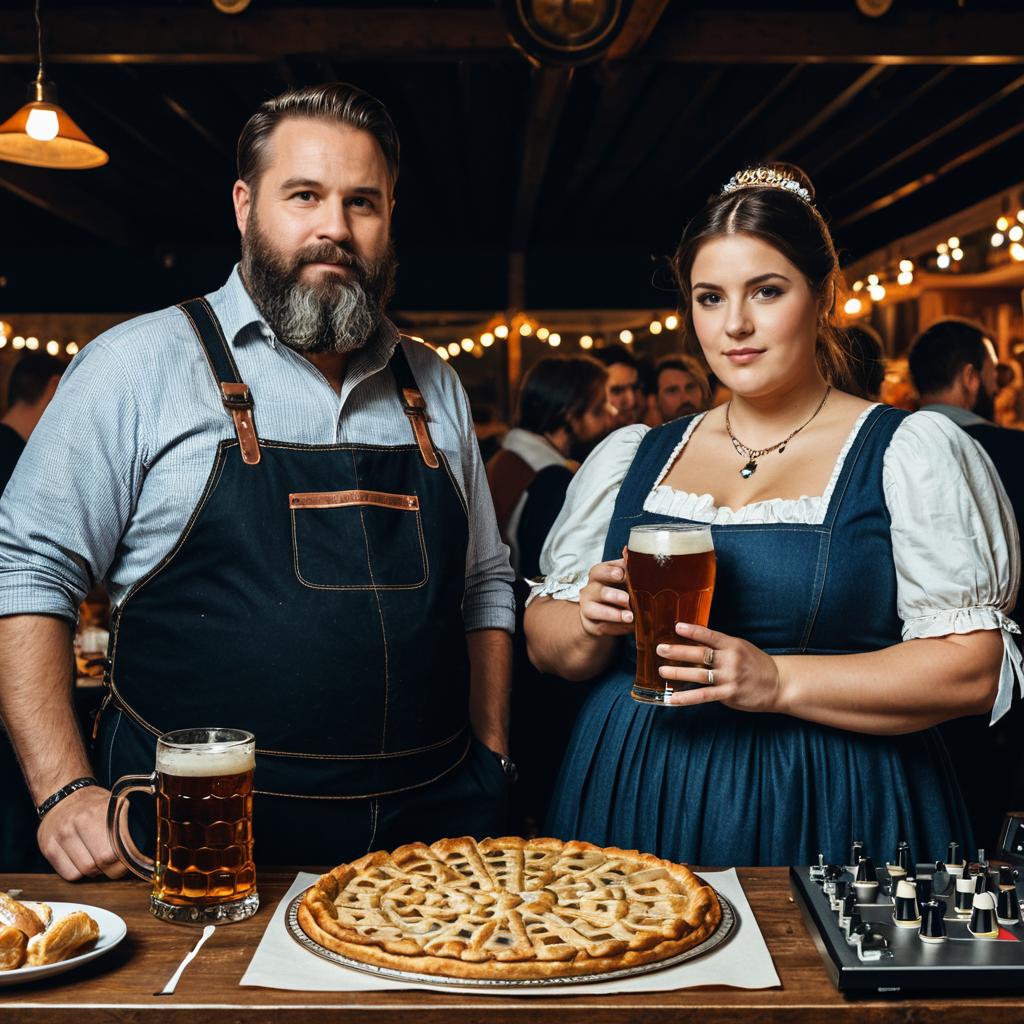 Portrait of a bearded man wearing a denim apron and a woman in a traditional Bavarian dress holding a glass of beer at an Oktoberfest celebration. They stand behind a wooden table featuring a large apple strudel and beer mugs, with festive lights and people in the background. The setting appears to be a lively beer hall.