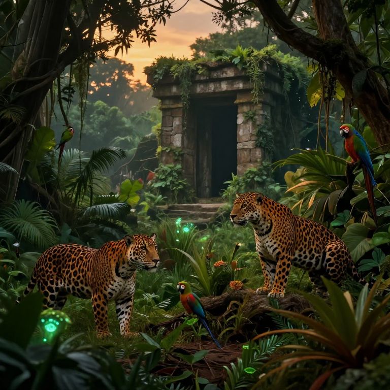Digital artwork of two leopards in a dense, lush jungle with glowing lights, near an ancient, overgrown stone archway, and colorful birds