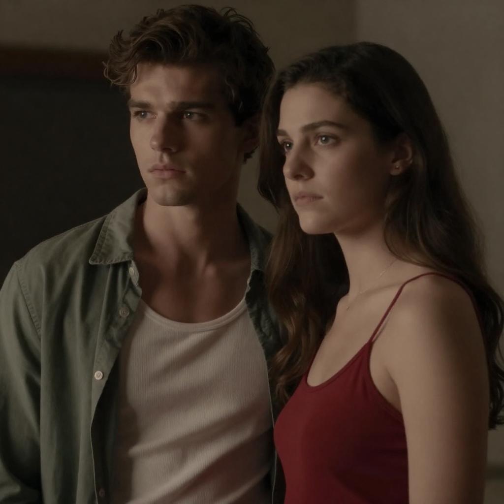 Photograph of two people in a room. Woman with curly brown hair, wearing a black lace camisole, stands in front. Man with short brown hair, wearing a white t-shirt, stands slightly behind her, looking to the side. Background includes a blue-framed mirror, light green and beige cabinets, and a framed picture on the wall. Both have neutral expressions.