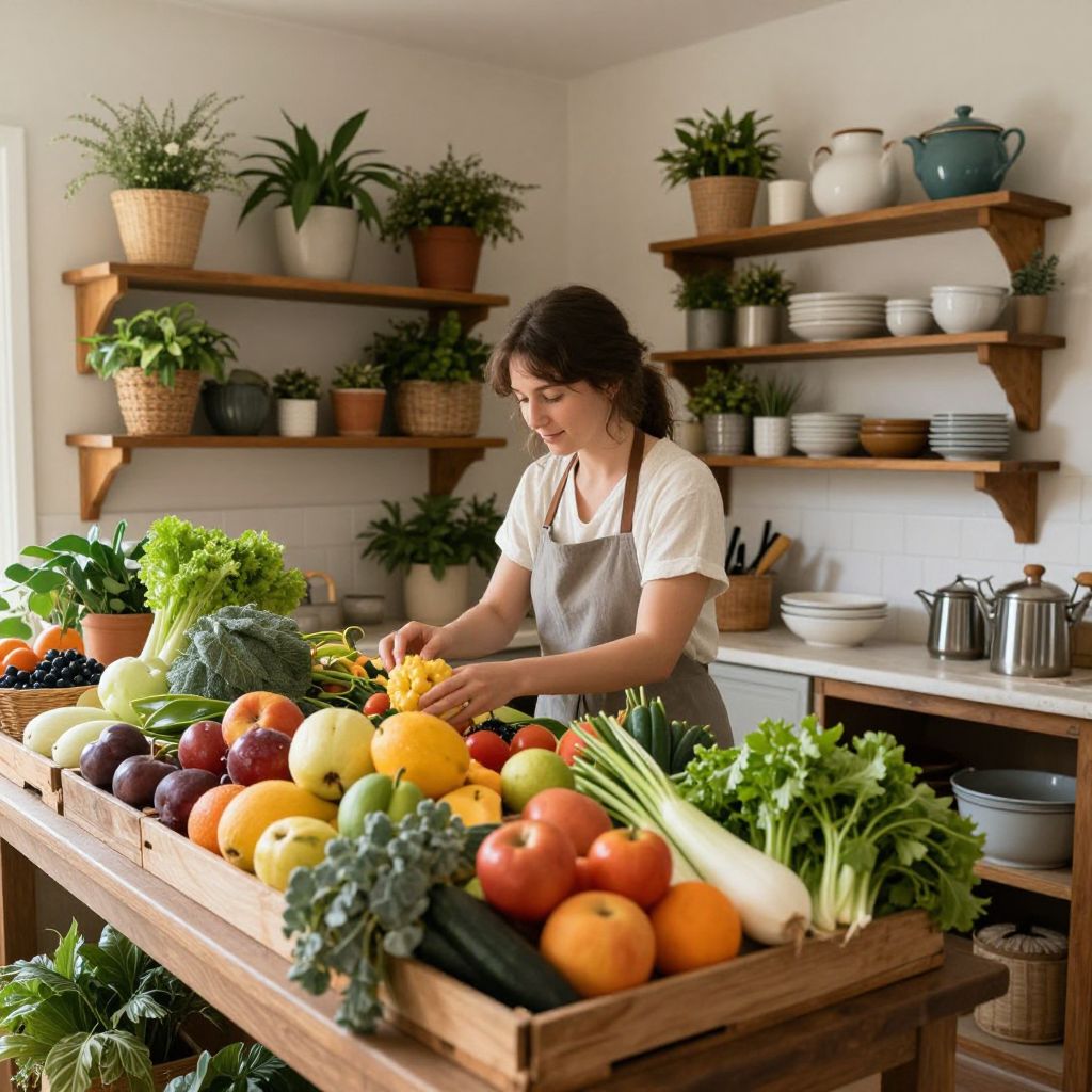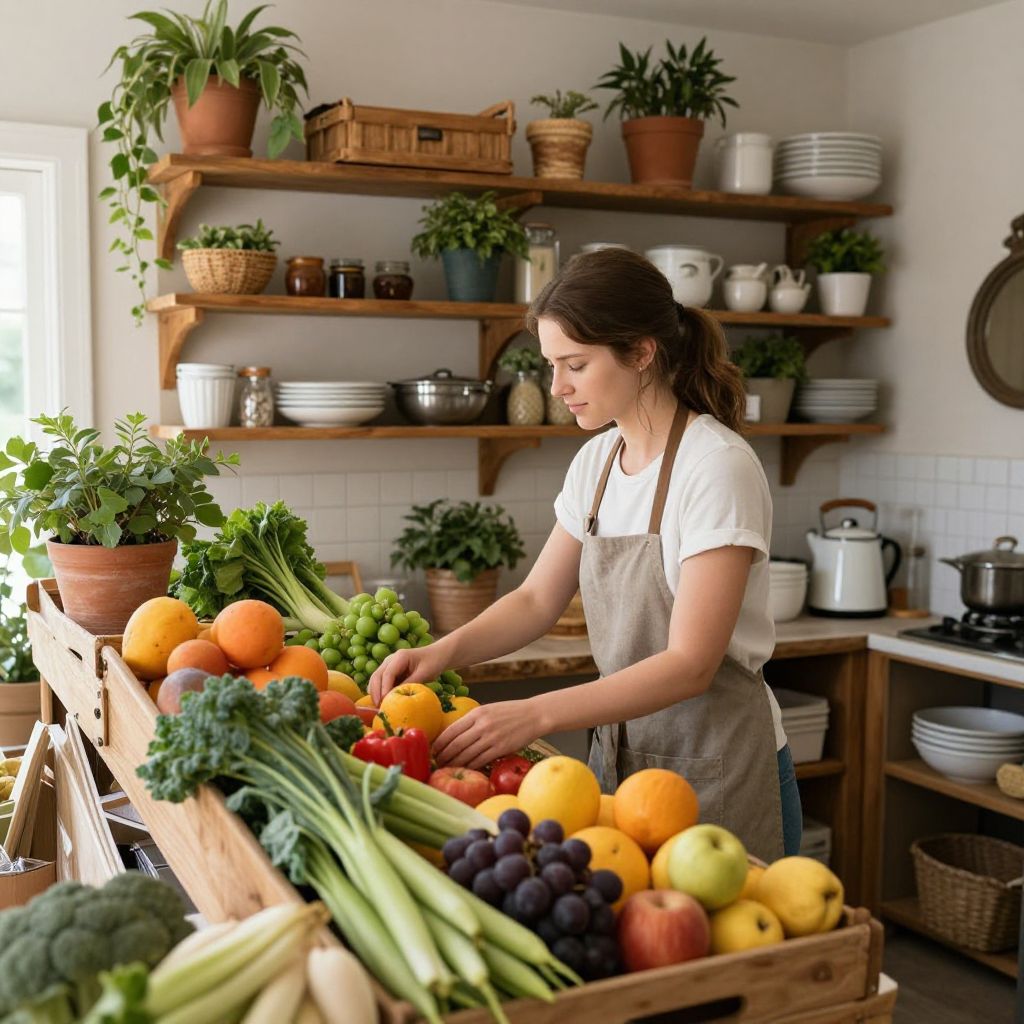 Woman arranging vibrant fruits and vegetables in a cozy farmhouse shop, surrounded by rustic shelves filled with potted plants and kitchenware, evoking a warm, homely atmosphere.