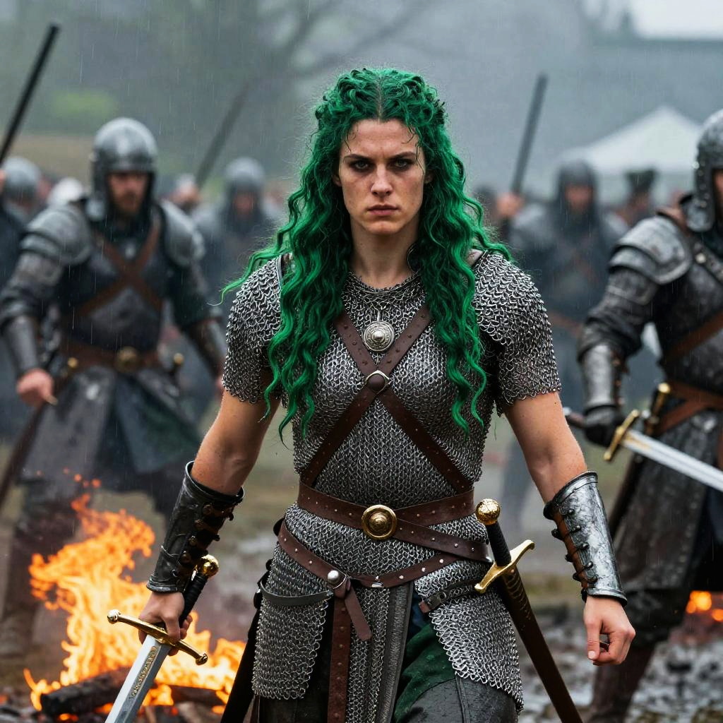 Realistic photo.Gorgeous muscular 25-year-old Celtic warrior with ridiculously long wavy emerald green hair, dressed as a warrior princess in complete chainmail armor and a gleaming broadsword, in the midst of a bloody and fiery battle during the height of a spring downpour. realistic photo