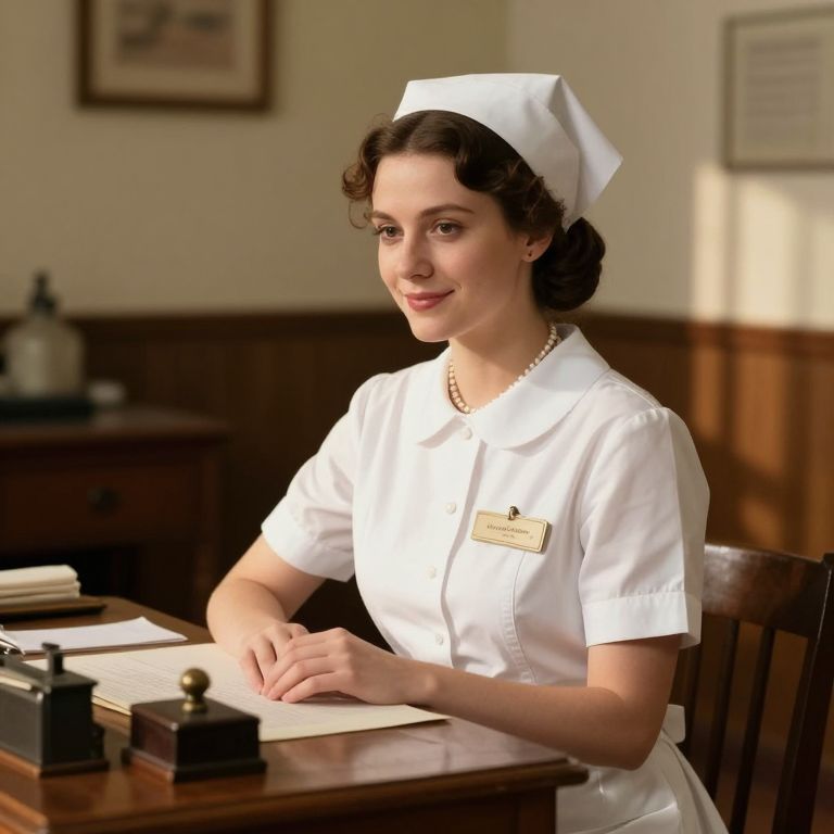 A beautifully detailed portrait of a 1920s nurse in a pristine white vintage uniform with a matching cap and nurse's name tag, sitting at a wooden hospital desk in a colonial-style hospital room from the 1920s, her face composed and gentle, wearing a soft smile, hair in a neat bun, wearing a pearl necklace, golden hour lighting casting soft shadows, classic vintage atmosphere with period-appropriate furniture and medical tools on the desk
