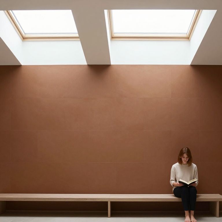 An interior view of a brown wall in a minimalist Scandinavian apartment, with soft natural light coming from large skylights; the wall features a smooth, warm brown finish with a few visible handmade tiles, and a sitting person with soft brown hair and a calm expression sits on a simple bench reading a book.