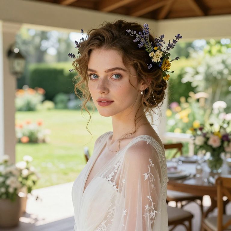 A natural lifestyle photo of a radiant bride with fair skin and kind, expressive blue eyes, wearing a modern bridal gown and a voluminous hairdo decorated with wildflowers and dried lavender, standing on a sunlit porch overlooking a blooming garden with wooden furniture and floral centerpieces.