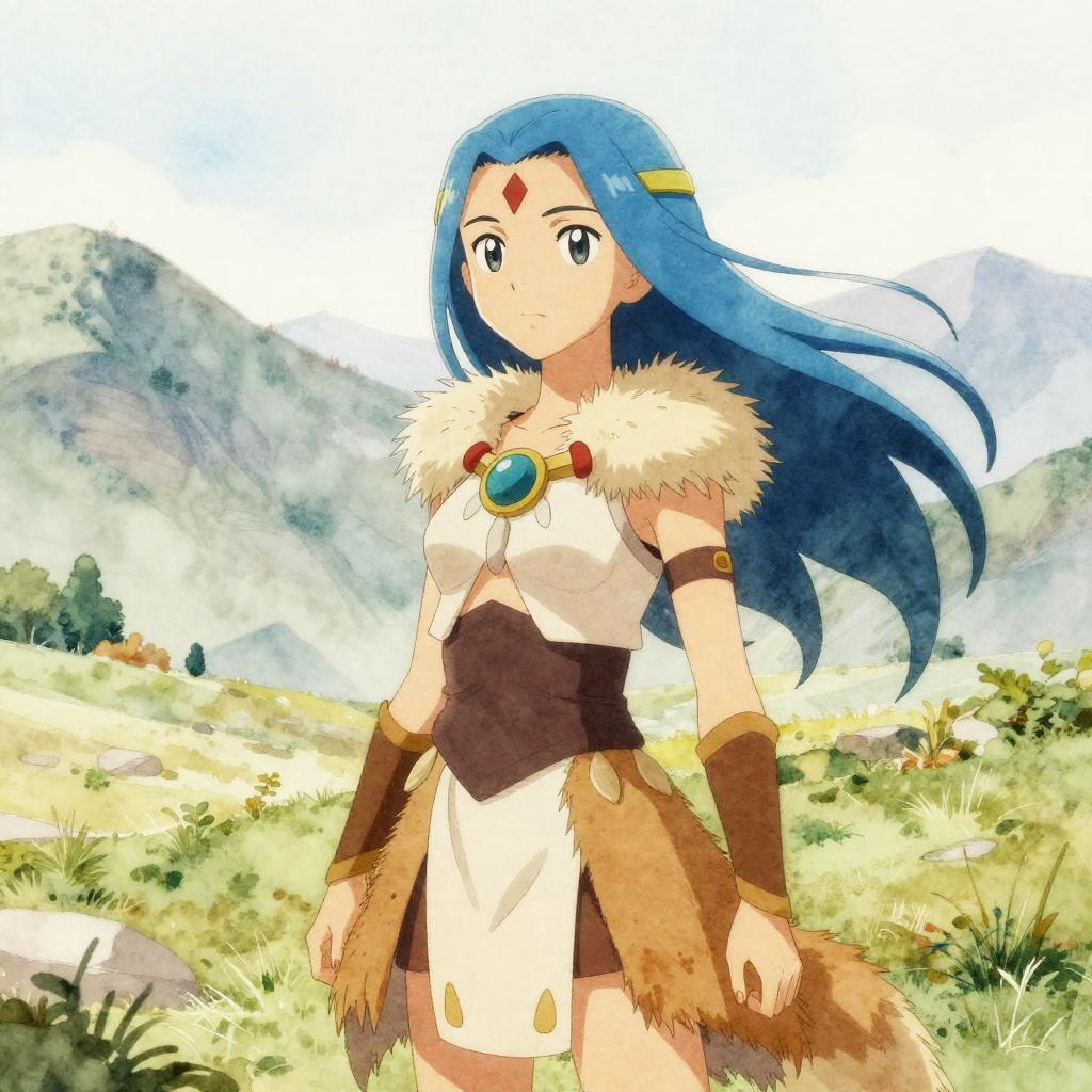 Lucario girl in a serene mountain landscape, wearing tribal-inspired clothing integrated with Lucario fur, long flowing hair matching blue hues, calm and confident expression, soft pastel color palette, wind gently moving her hair and clothes, watercolor style.