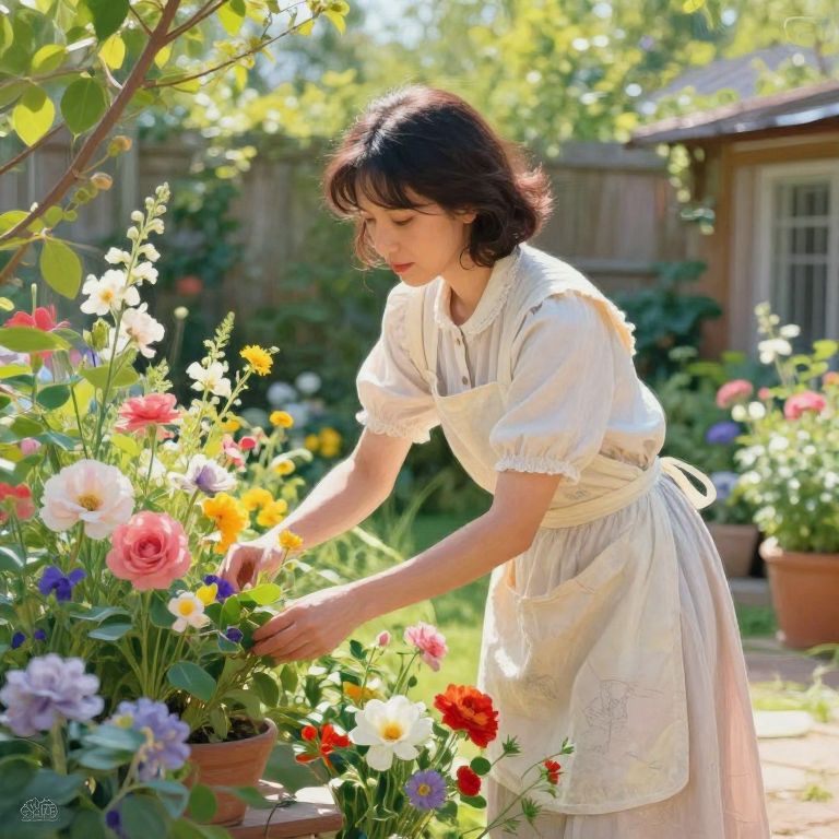 Transgender maid arranging fresh flowers in a sunlit garden courtyard, dressed in a delicate apron and soft cotton dress, vibrant blossoms and greenery surrounding, impressionistic art style with rich colors and flowing lines, peaceful and uplifting composition.