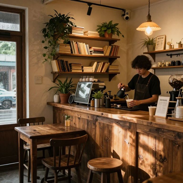 Zizzy, a cozy vintage cafe interior with rustic wooden furniture, warm lighting casting soft shadows, shelves filled with old books and plants, a barista carefully preparing coffee, nostalgic and inviting atmosphere on a rainy afternoon.