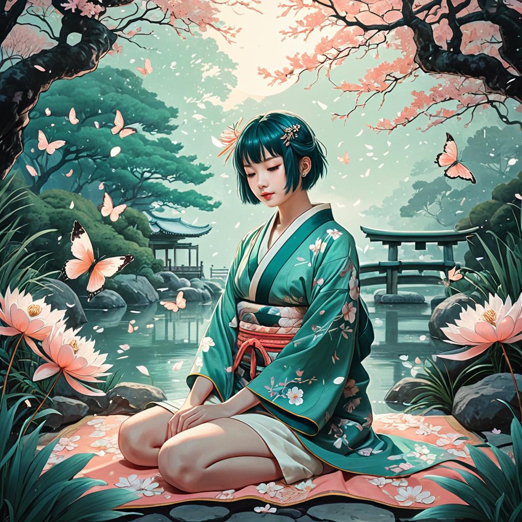 A detailed anime-style illustration of a calm teenage girl with short teal hair decorated with delicate feathers, wearing a flowing kimono adorned with sakura petals and crane motifs. She is sitting peacefully on a floral mat in a misty Japanese garden at dawn, surrounded by glowing butterflies, cherry blossom trees, and tranquil water. The scene is characterized by soft pastel colors including coral, gentle green, and cream, with intricate foliage and traditional Japanese architectural elements in the background, creating a magical and dreamlike atmosphere.
