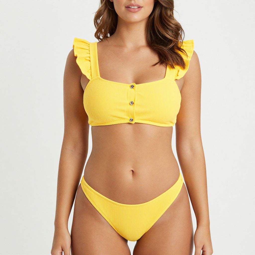 Photograph of a young woman with light brown, wavy hair, wearing a bright yellow ribbed bikini. The bikini top has ruffled shoulder straps and a square neckline with small buttons down the front. The matching bikini bottom is low-rise with a wide waistband. She has a toned, tanned physique with a flat stomach and visible hip bones. The background is plain white, making the yellow bikini stand out. Her lips are slightly parted, and her head is partially out of the frame. The overall style is casual and summery.