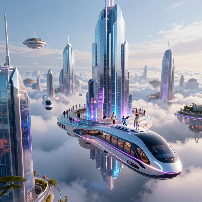Fantasize a futuristic city suspended in the clouds, where sleek, floating vehicles zip between crystalline skyscrapers, neon lights reflect off glass surfaces, and people in shimmering attire explore a world blending technology and fantasy seamlessly.