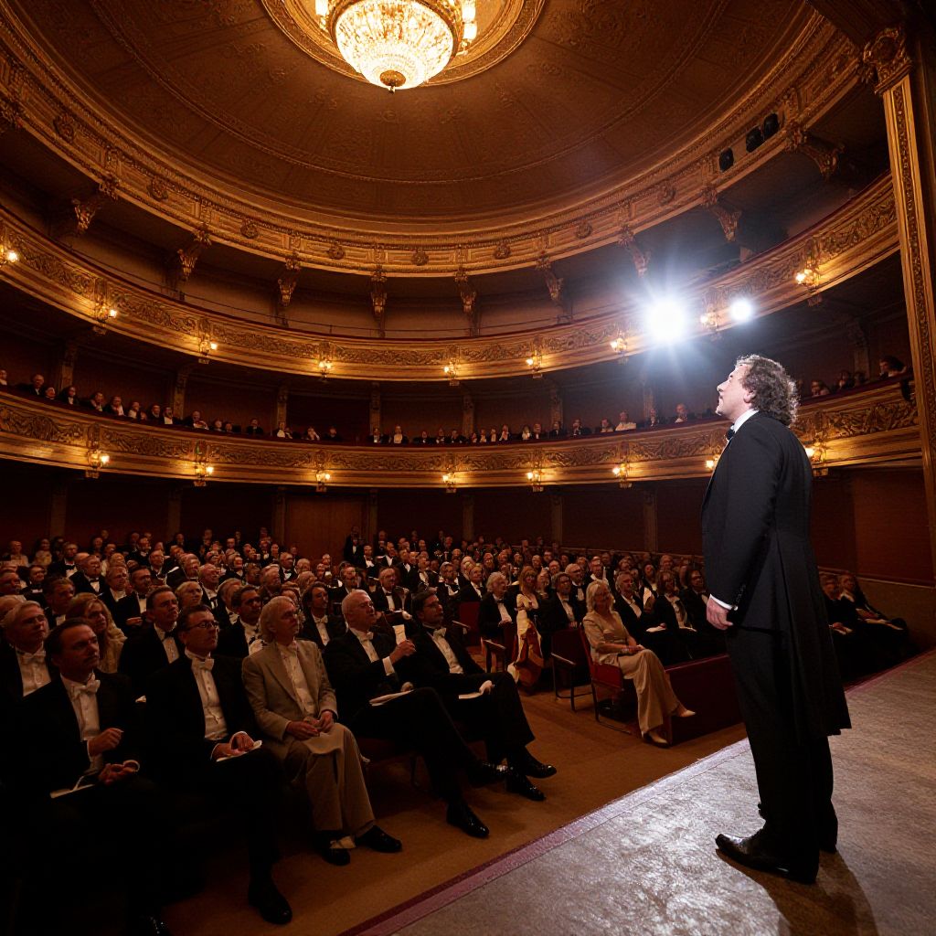 A sweeping shot of an opera house auditorium, filled with elegantly dressed patrons, the grandeur of the architecture in the background, with a spotlight shining on the stage where a tenor is passionately performing a solo, the atmosphere electric with anticipation