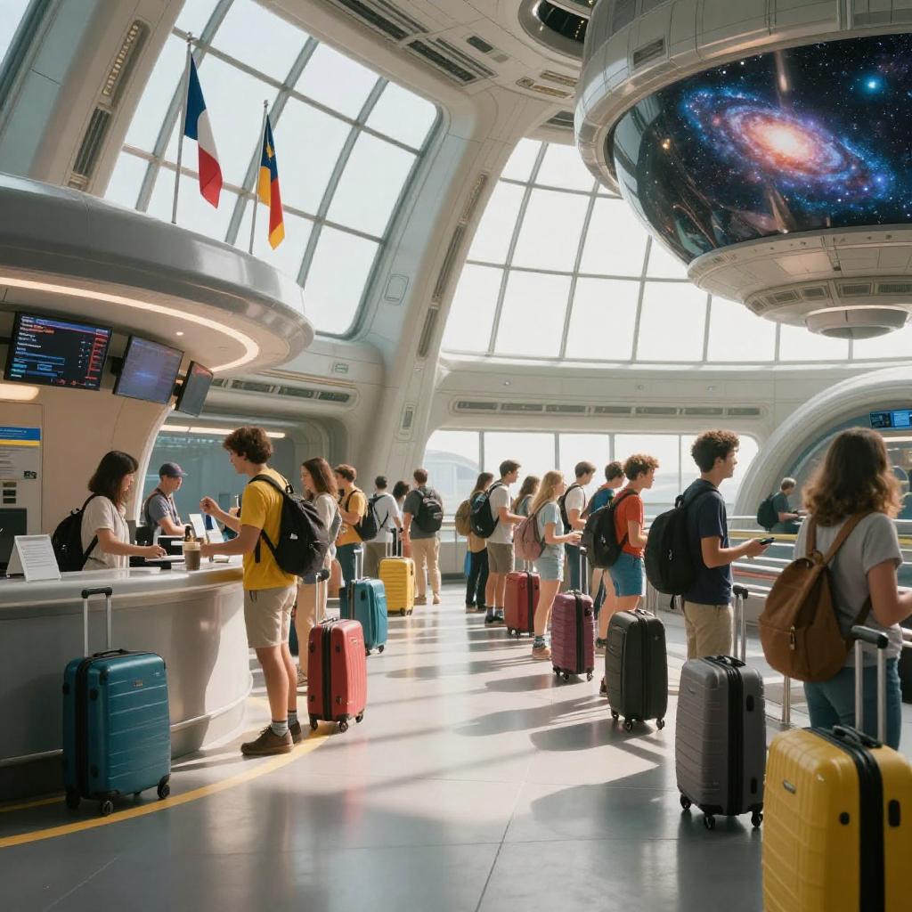 FlonixSideView, sci-fi, futuristic, photorealism, photorealistic, highly detailed, 8K, HD, Cinematography, mega scans, cinematic, hyper-realistic, photo real, cinematic composition, vray, render, raytracing, SPLENDID, BEAUTIFUL, AWARD WINNING, NATURAL LIGHT, PHOTO REALISTIC, 4K, HIGH DEFINITION, SMOOTH, SHARP FOCUS, CINEMATIC LIGHT, DEPTH OF FIELD, DETAILED EPIC CINEMATIC CONCEPT ART, CENTRED IN FRAME, HYPER REALISTIC, EXCELLENT COMPOSITION, AESTHETIC, VERY INSPIRATIONAL, CINEMATIC ATMOSPHERE, DRAMATIC CINEMATIC LIGHTING, 85MM, HDRI, Travellers waiting in line at an intergalactic space station terminus, ticketing booth, coloured, luggage and suitcases, tile floor, well lit, touristic, vacation ambience, joyous, hope, daylight, bright, planetary flags, bay windows, galaxy in the distance, service robots, caddies, people, advanced technology, shops and storefronts, restaurant, aliens, robots, technology, crowded, vacation, departure, touristic station, touristic agents, humans, cyborgs, pets, cosmonauts, astronauts, tourists, (FlonixSideView:1.5)