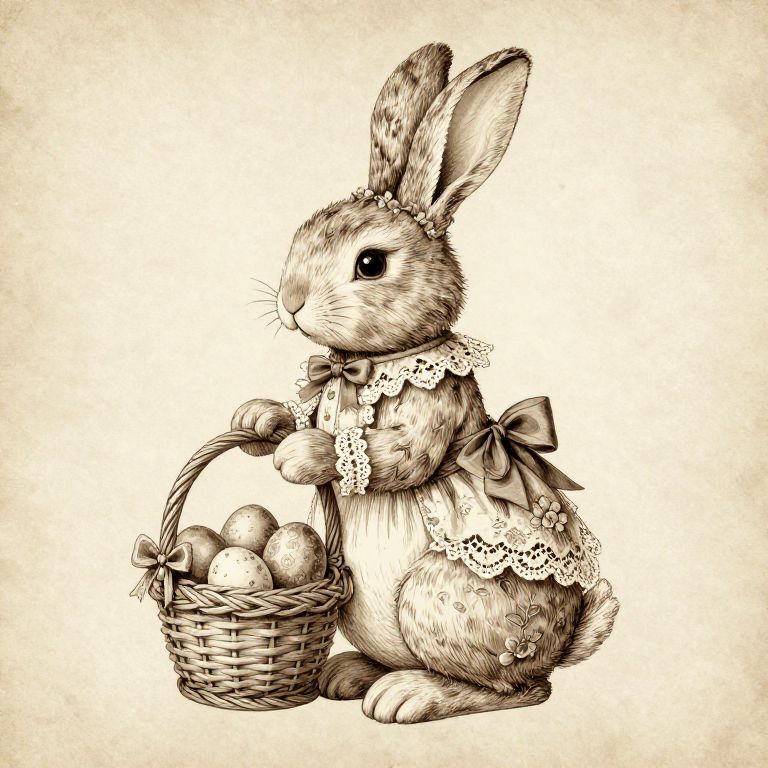 This is a detailed, sepia-toned, ink drawing of an anthropomorphic rabbit. The rabbit, with large ears and expressive eyes, is dressed in an ornate lace dress adorned with a bow on the back. It holds a wicker basket filled with eggs, positioned in its front paws. The rabbit's fur is meticulously shaded, giving a textured appearance. The background is a simple, light beige, which makes the rabbit and basket the focal points. The overall style is reminiscent of vintage illustrations, with a classic, whimsical charm. The rabbit's attire and the eggs suggest an Easter theme.