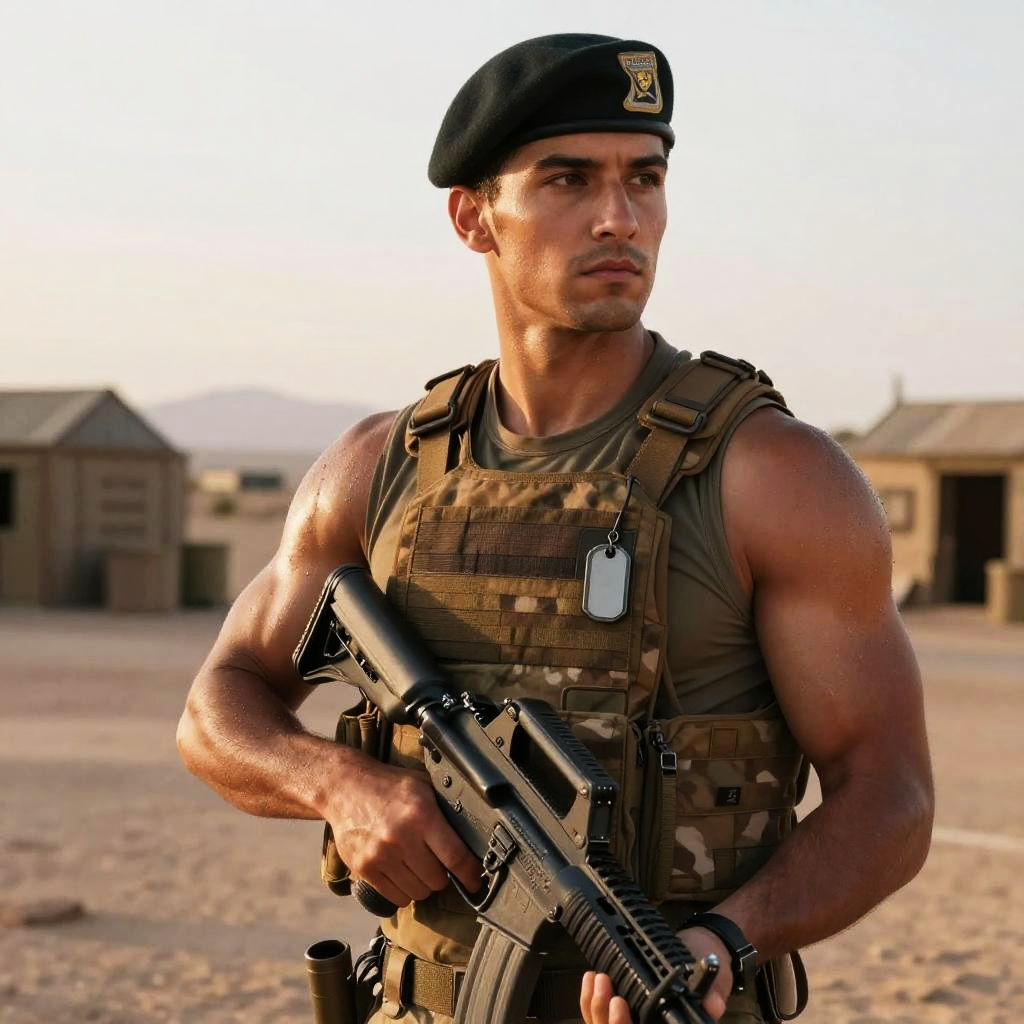 Realistic, masterpiece, best quality, natural lighting, soft shadow, insane detail, detailed background, professional photography, depth of field, intricate, detailed face, subsurface scattering, realistic hair, realistic eyes, muscular, masculine, (large pectorals:1.3), shiny skin, (sweat:0.5), photo of a handsome man, outdoors, desert, military camp, sky, sunset, camouflage pants, dog tags, holding gun, assault rifle, beret, vest