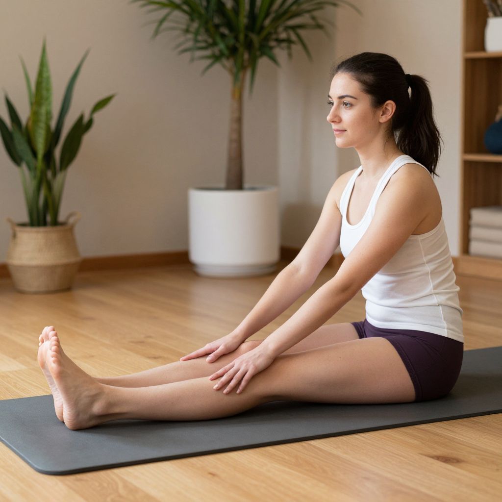 A photograph of a young woman with fair skin and black hair in a ponytail, sitting on a gray yoga mat in a bright, minimalist room with wooden floors. She is wearing a white tank top and black shorts, seated in a straight, side-sitting position with her legs extended forward and hands resting on her knees. The background includes two potted plants—one in a beige pot and the other in a white pot—along with a wooden bookshelf. The woman has a focused expression and is practicing a yoga stretch. The image has a realistic, natural lighting style.