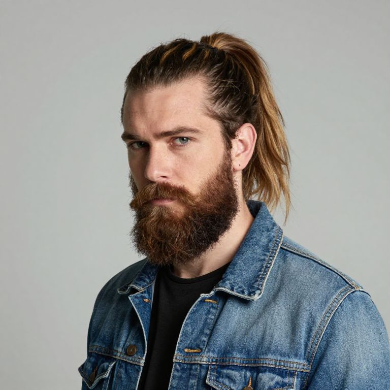 Mullet ponytail male portrait, rugged beard and intense gaze, soft studio lighting highlighting textured hair layers, casual denim jacket, minimalistic backdrop