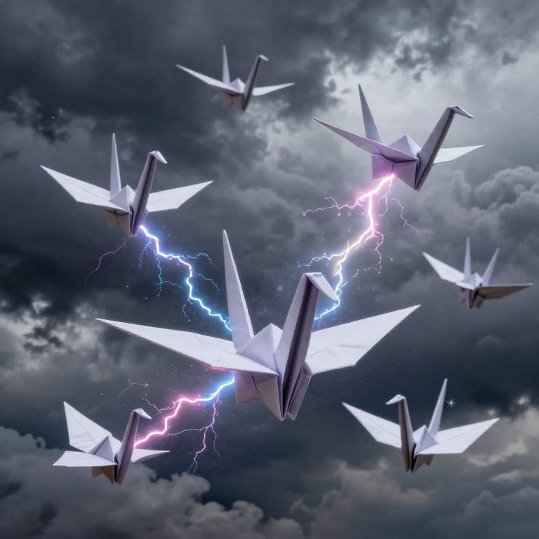 Giant origami cranes fold themselves from storm clouds and fly in geometric patterns, each flap of their wings triggering a burst of multicolored lightning.