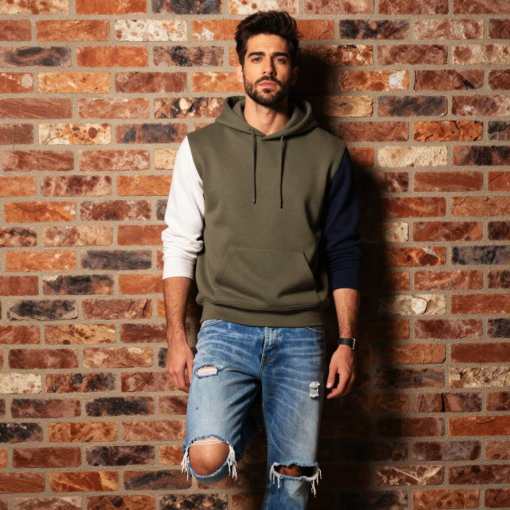 An artistic portrait of a stylish man posing confidently against a rustic brick wall backdrop, embodying a casual urban fashion sense with a hint of edginess reflected in his ripped jeans and layered hoodie.