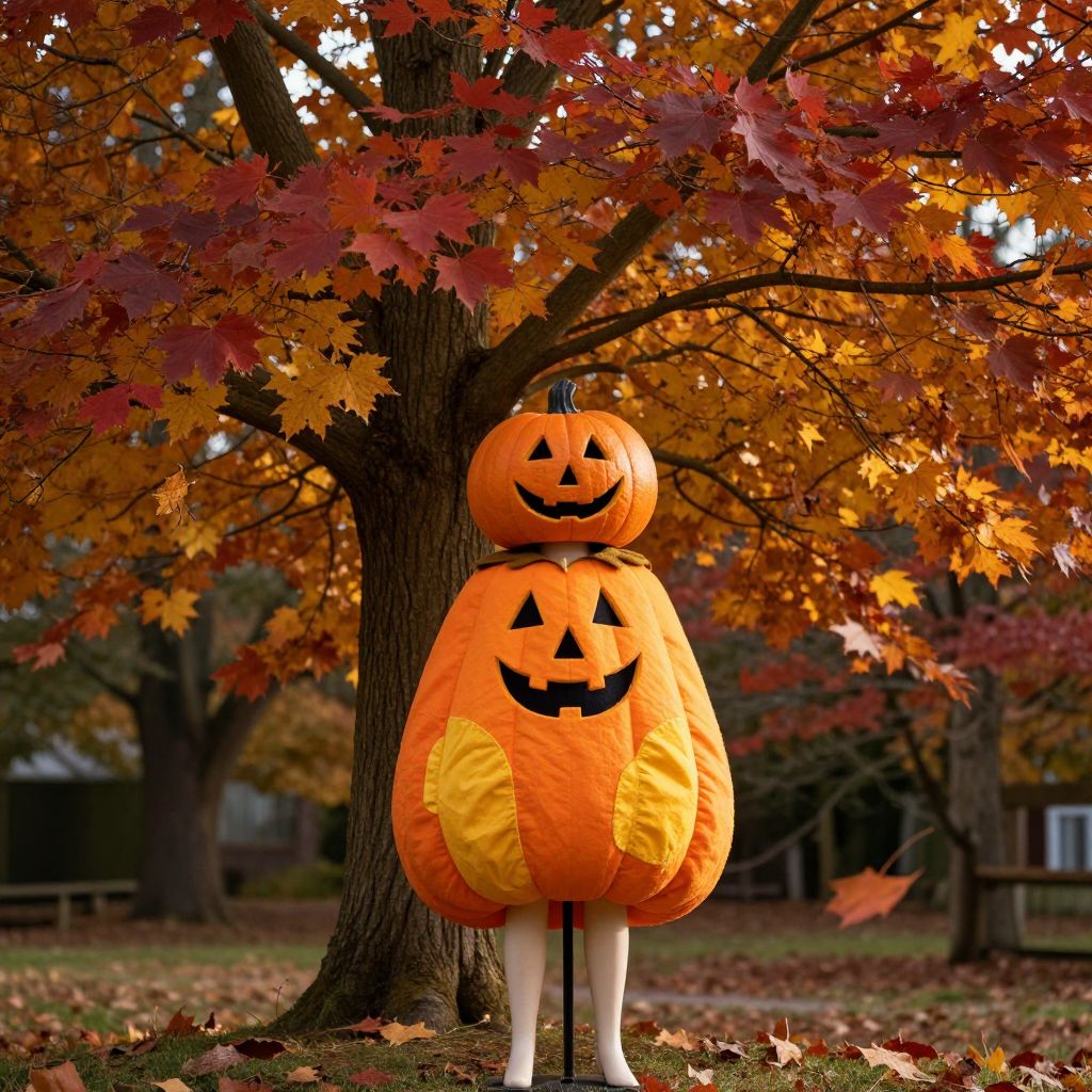 A mannequin dressed in a detailed pumpkin costume, with orange and yellow patches, carved pumpkin face features, and a festive, autumnal design, standing proudly in front of a tall, leafy tree adorned with vibrant red, gold, and amber autumn leaves swirling gently in the breeze. The scene is set in a quiet, rustic outdoor setting during late fall, with soft sunlight filtering through the trees, creating a warm, cozy, and festive atmosphere. The mannequin has a slightly exaggerated, playful expression, as if it's part of a holiday display, blending humor and seasonal charm.