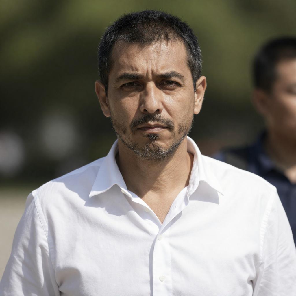Photograph of a middle-aged man with graying hair and beard, wearing a striped gray shirt, leaning on yellow scaffolding in an industrial setting. He has a serious expression, with his head slightly tilted and hands resting on the scaffolding. The background is blurred, highlighting the yellow scaffolding and his focused gaze.