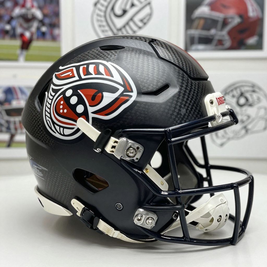 Custom football helmet maker crafting a personalized football helmet inspired by tribal art and modern sport design, textured materials like carbon fiber and matte paint, creative studio atmosphere with reference images and artistic sketches around