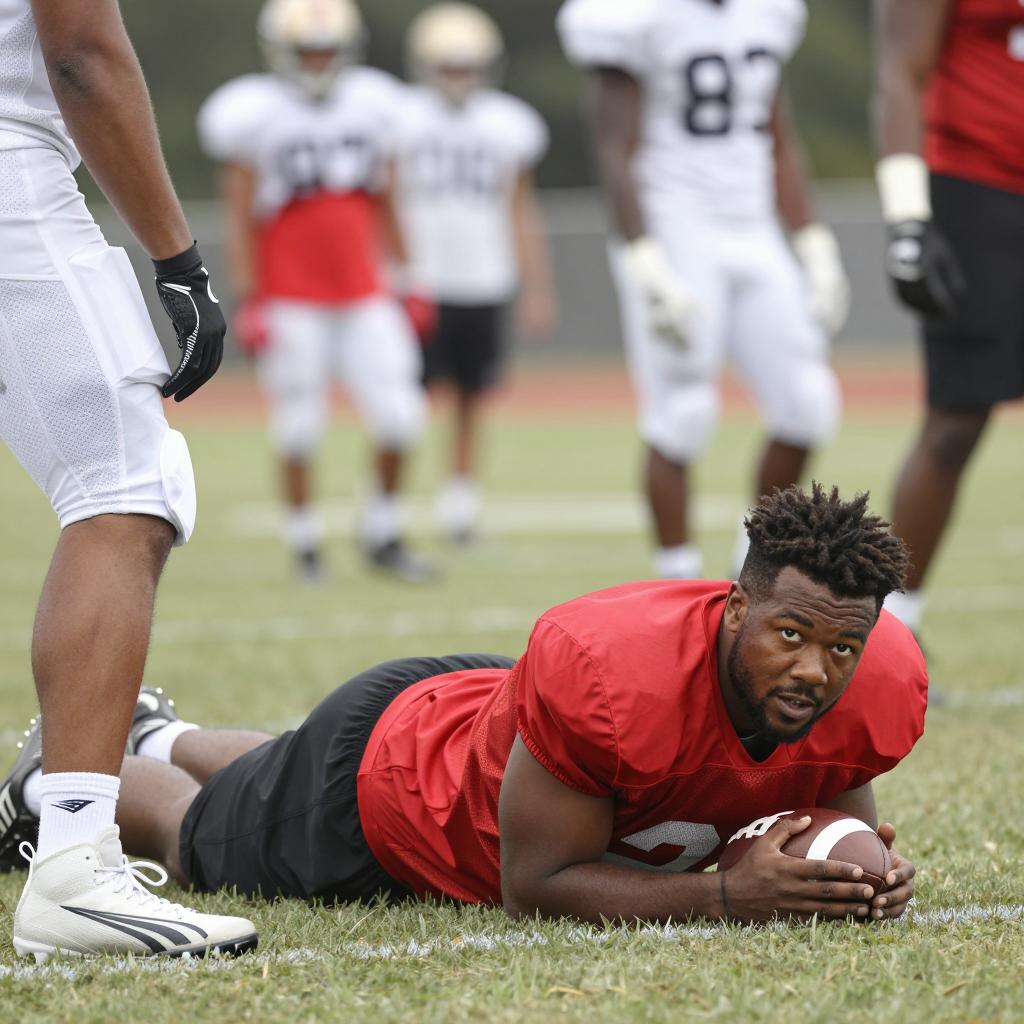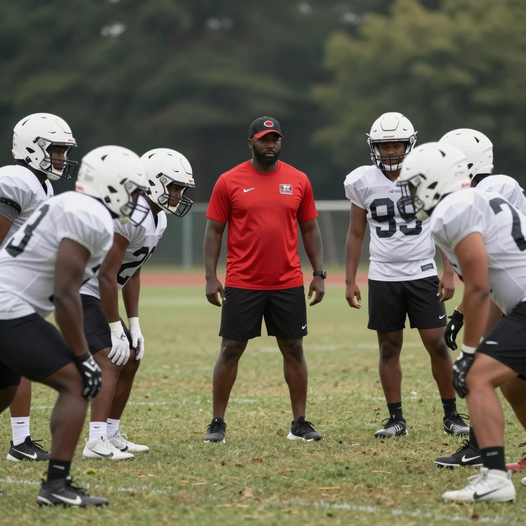 Photograph of a football practice. Black coach in red shirt and black shorts stands in center, surrounded by 8 white players in white jerseys and helmets. Players in various running positions on grass field, forest in background. Sunlight illuminates scene. Coach's focused expression, players' intense body language.