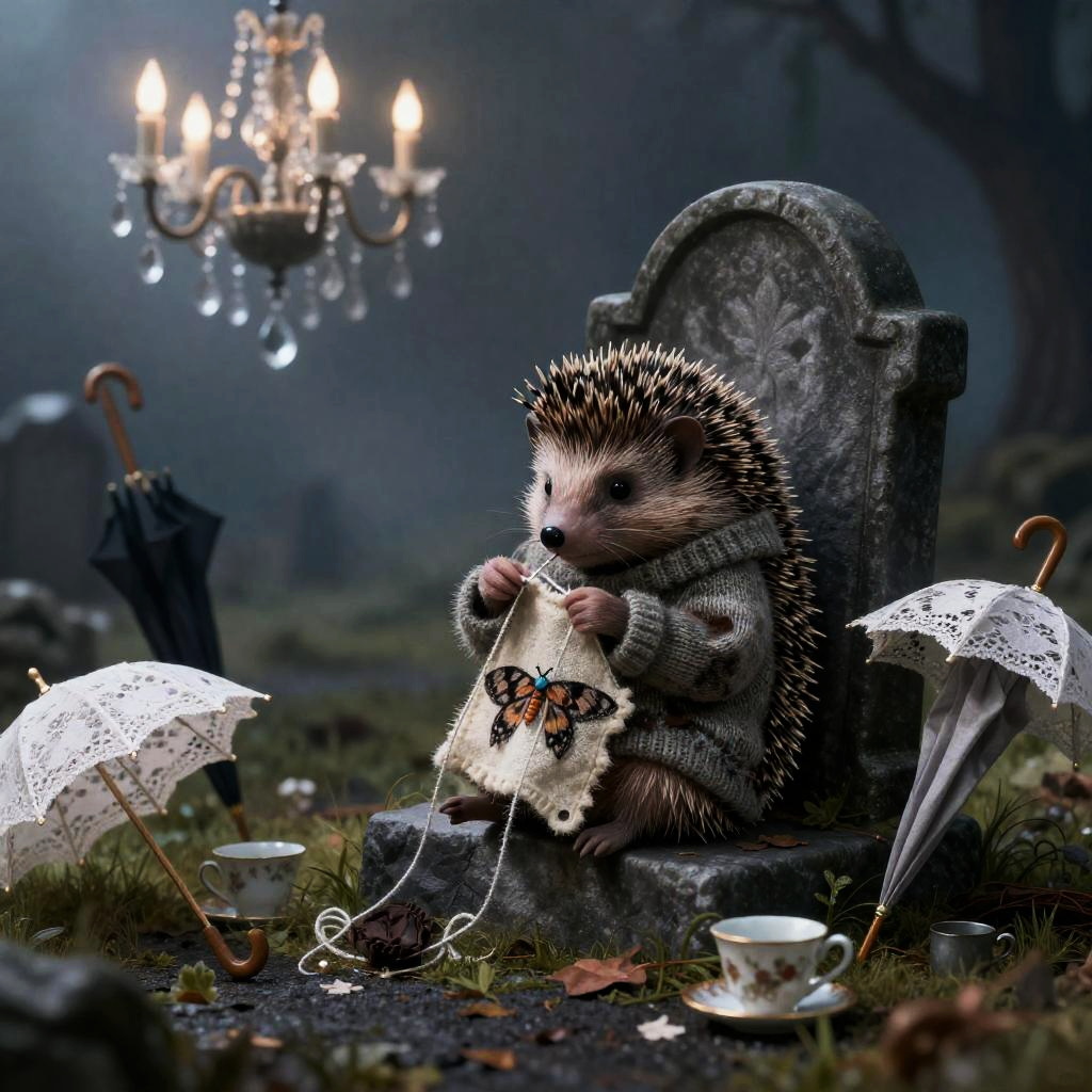 Whimsical art style inspired by Tim Burton, Edward Gorey depicting a tiny Victorian ghost hedgehog delicately knitting a moth-eaten sweater sitting alone on a crooked gravestone in a misty graveyard, surrounded by a clutter of antique umbrellas, dripping crystal chandeliers, scattered porcelain teacups, and leaning lace parasols.